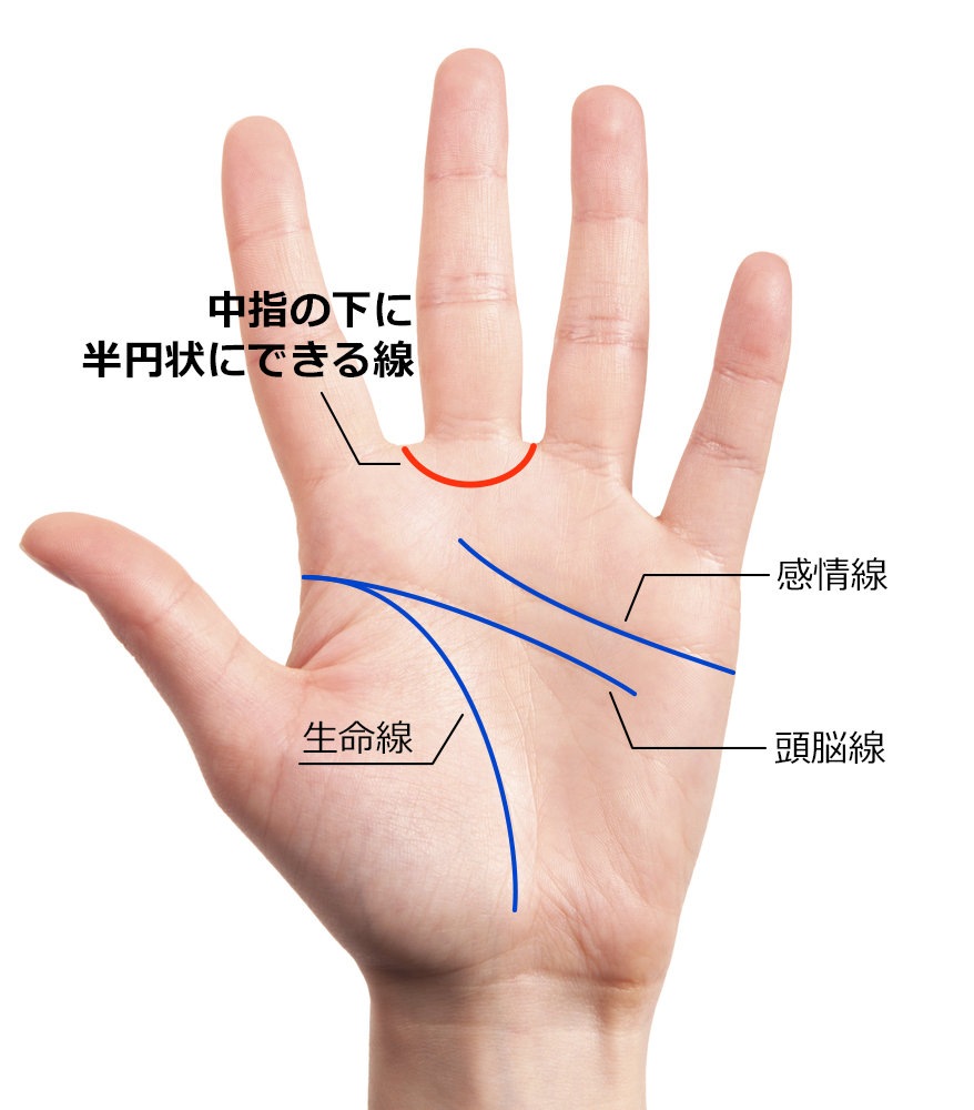 ・中指の下に半円状にできる線。一部が切れていたり、V型に近い場合もある。