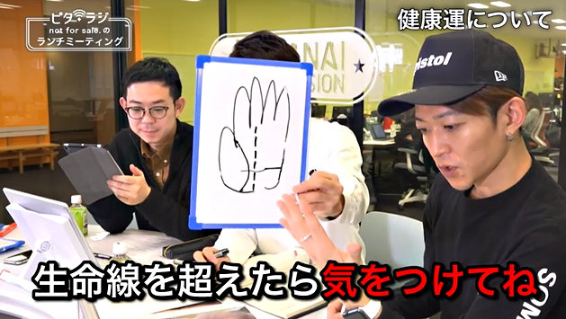 『not for sale.のランチミーティング』(占いTV:uranaitv.jp)は、メンズ占い師ユニットnot for sale.のメンバー・Ryoz、Hoshi、SUGARが多彩なテーマでトークを繰り広げる番組だ。番組内でHoshiは、健康にまつわる手相について解説した。