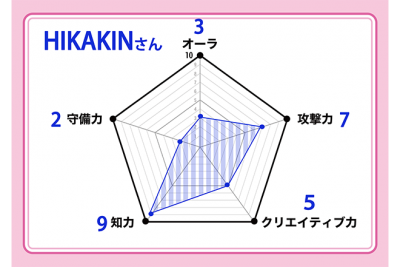意外にも攻撃力が低い松居さん。高い守備力は「信念」を表しており、彼女の強い意志を感じることができそうだ。全体的なバランスを見ても、YouTuber向きともいえるかもしれない。