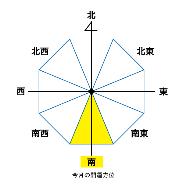 2月の開運方位は「南」です。「九紫火星」に影響を受け、「装飾」「華やか」「名誉」などをあらわします。南方位は、時間でいえば「午刻」。太陽が真上に移動し、光がいっぱいに降り注いでいるときです。訪れることで、まるでスポットライトが当たったように周囲から注目され、自身の輝きが増していくでしょう。恋が実ったり、仕事で昇進したりする可能性も高くなります。