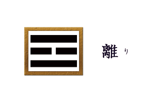 2つの陽爻の間に、陰爻が挟まれている構成が離です。中心は暗くても外側は輝いているという形から、火の象徴とされます。すべてのものを照らし、識別する知識や正しさを示す八卦の1つでもあります。また、明るさ、美しさ、明晰さなどの意味を持ち、装飾や美麗、情熱や競争、発明なども表してもいます。