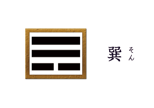 2つの陽爻の下に1つの陰爻で構成されているのが巽です。陰が下で密かに入り込んでいる様子から、流動する風を表しています。いかなるすき間からも吹き入る、進入や伏入を示す八卦の1つです。進退、動揺、命令、疑惑、素直、利益などの意味があり、神仏、香り、潜伏なども表しています。