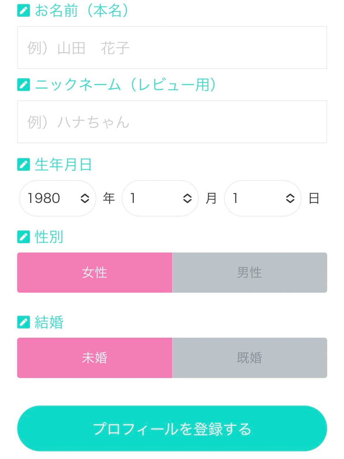 お名前・ニックネーム・生年月日・生年月日・性別・結婚を選択または記入し、『プロフィールを登録する』に進みます。
