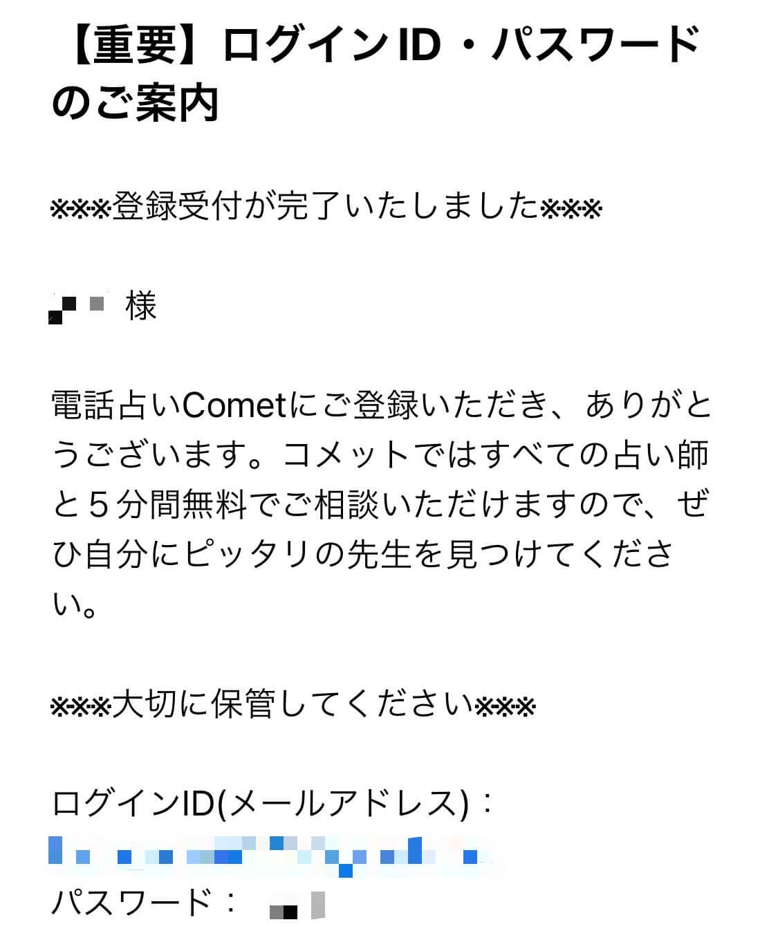 会員登録が完了すると件名『【重要】ログインID・パスワードのご案内』にてメールが届きます。
