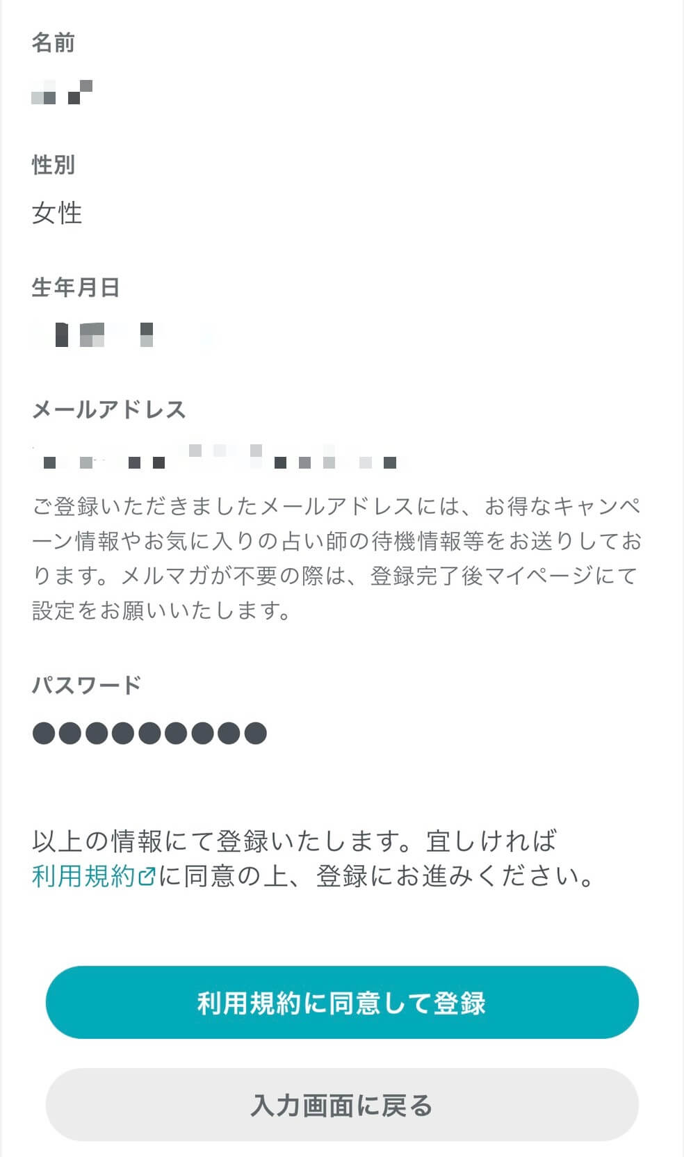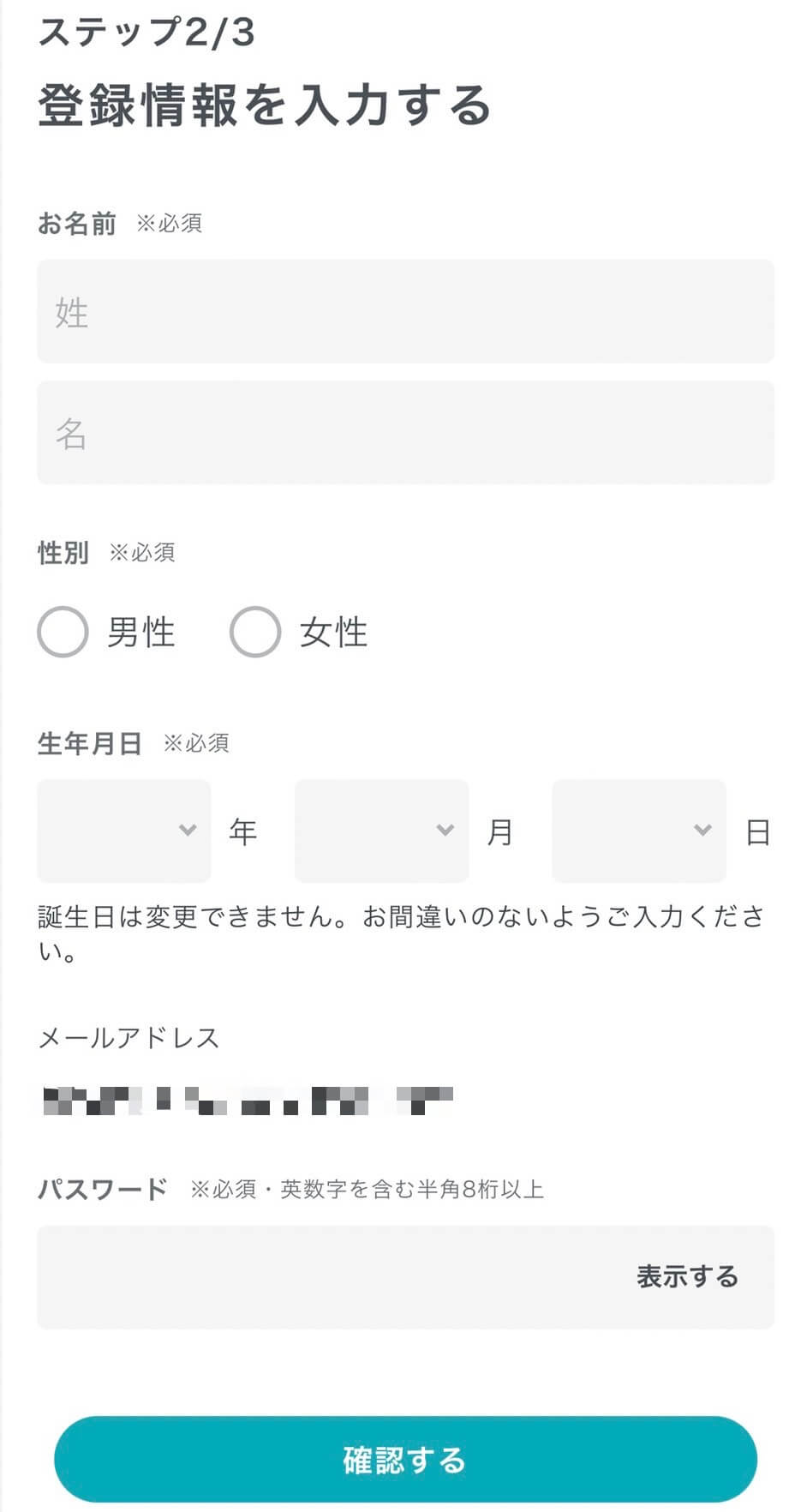 お名前・性別・生年月日・パスワードを入力します。入力を終えたら、『確認する』をタップ。